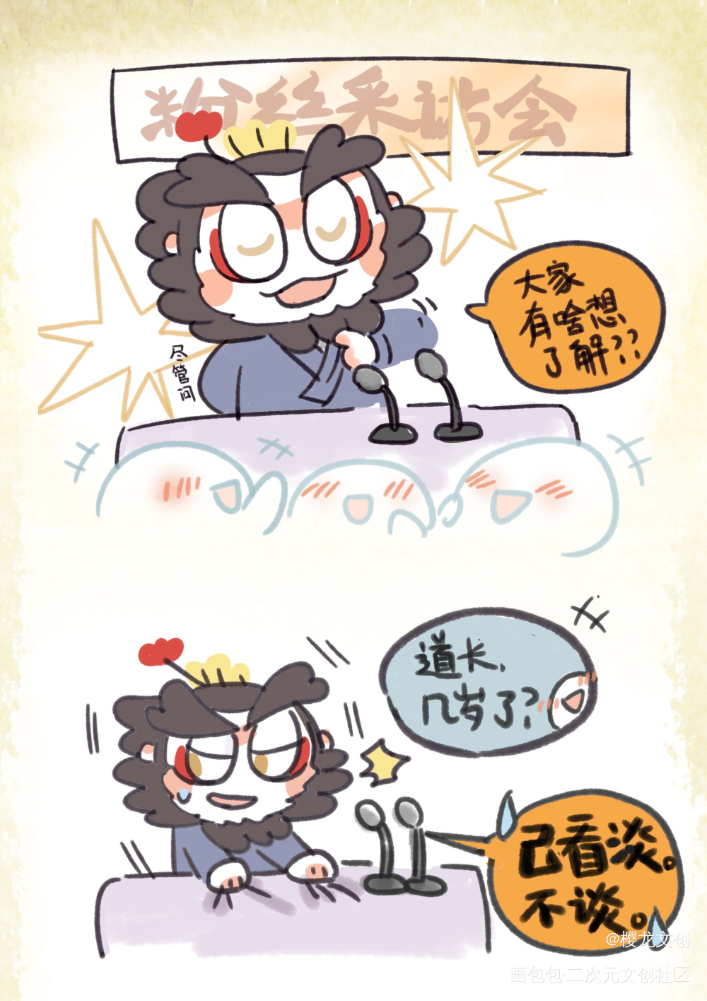 “大家有啥想了解的嘛?” “道长几岁了?” “已看淡,不谈不谈!”(解释不清楚) “道长您哪儿人?” “俗世隔绝,不谈不谈!” “道长...” “我修行去啦!!!哼!!!(开溜)” 道不问寿,道不问俗,道不言修。 互相尊重,各自安好。