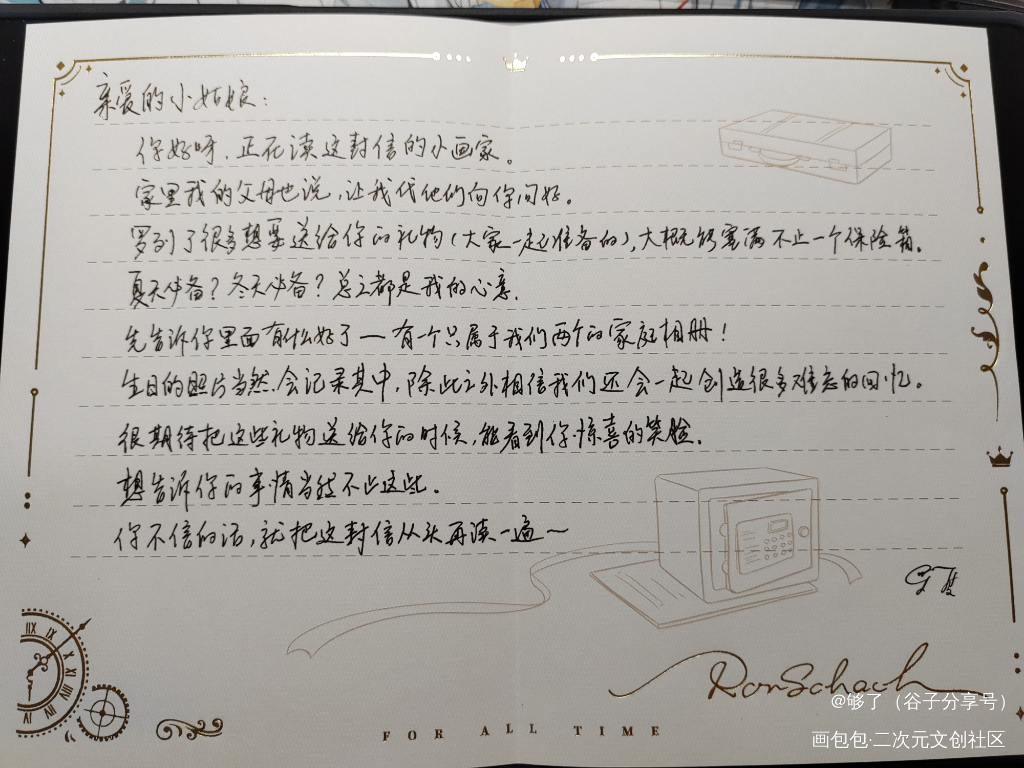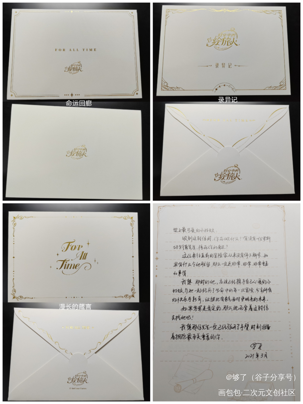 ①命运回廊手写信(p2) 绘旅人第一次出手写信,这个信封做的有点草率,但是封皮还是做的很好看的 这是封藏头信,每段开头连起来是“你家罗夏先生很想你”,暗戳戳的说很想见到你啊。 市价:85r左右(但是能蹲到70左右的) ②录异记手写信(p3) 封皮还是很精致,信封打开方式变了。 这封信最下面有个小饕餮的图案,很可爱的罗夏发现你偷偷准备了惊喜,所以写了这封信藏起来,就是不知道是惊喜先来还是你先发现这封信。 市价:40~45 ③婚礼的箴言手写信(也叫三周年)(p4)封皮上有“For All Time”,我很喜欢这个设计,打开方式跟录异记一样 是在列车上给你写信的罗夏呀,罗夏很确定以后的日子都能和你在一起呢 市价:40~55 ④美术集里的手写信(p5) 美术集最后几页有全员的手写信,就一面,有的正反面是不同男主的手写信,一点仪式感都没有。 这封信的日期是2021年3月,应该是21年白情确定关系之前写的,时隔两年半才给你看罗夏很自信还和你在一起呢 真的很喜欢手写信啊,心情不好的时候就喜欢翻手写信,看我心情会好很多。罗夏的信件里没有直白的说爱意,感觉都是在碎碎念中透露的爱意💑 #高质量美谷##时空中的绘旅人##时空中的绘旅人罗夏#