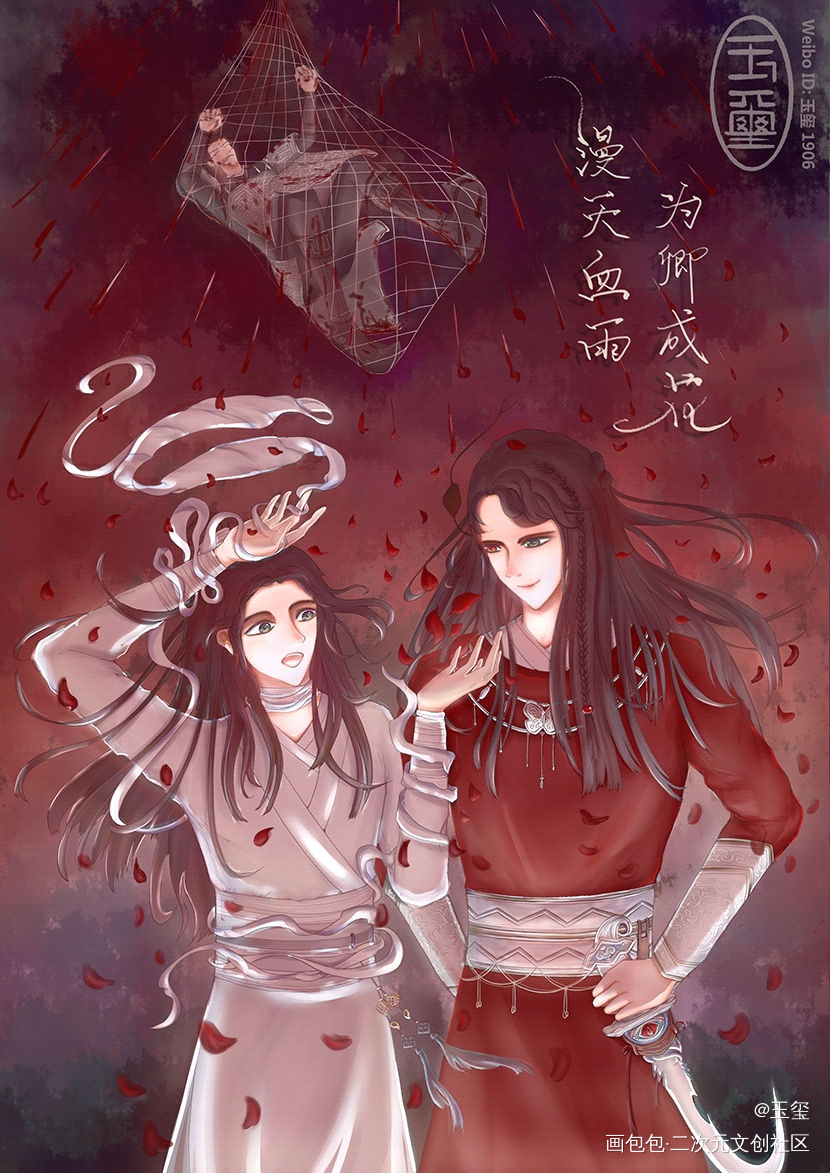 天官赐福,同人插图-血雨化花 灵感来自于小说154章结尾,裴茗将军被吊在空中,花城将即将撒至谢怜头上的血雨化成了飞花,对此场景深有感触,于是希望能还原这个场面