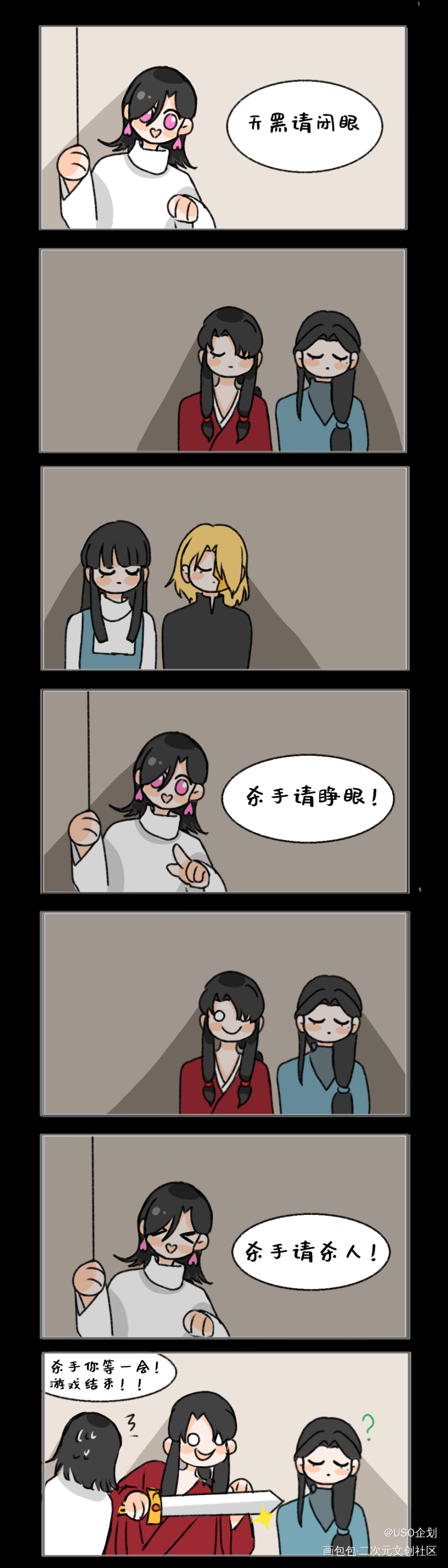 【oc借梗】苏醒了!猎杀时刻! 梗概来源:《非人哉》狼人杀片段,真男人从来都是亮真刀真枪的! 人设:秋-敖烈,松寒-九月,颜尧之-刑天,半面金,唐烟景。