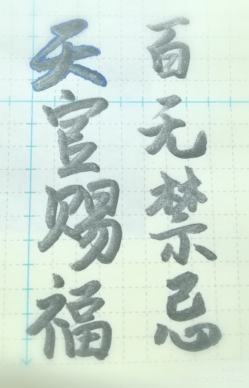 “天官赐福 百无禁忌” 用了两种颜色的笔,第一个是银色还带点细闪的那种,但是拍出来就有点黑色的样子(绝对不是黑的),第二个是金色但是有点色差就有点像黄色 求个点赞和关注,想认证字手(。・ω・。)ノ♡