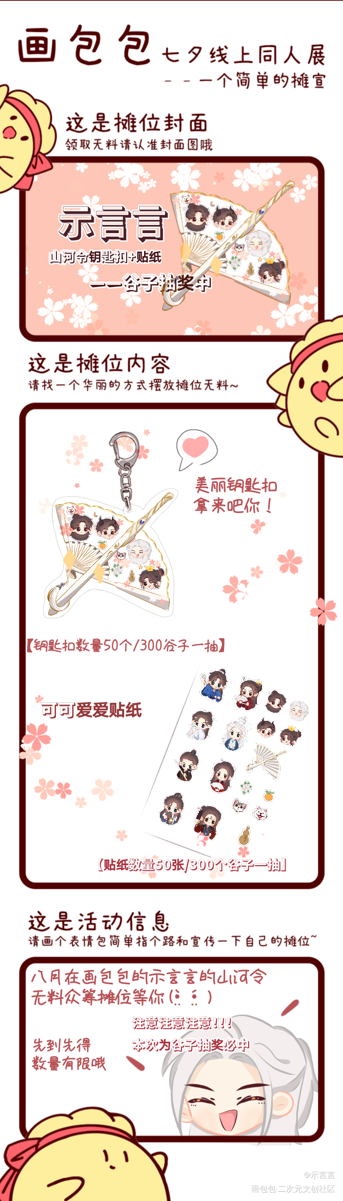 还是这里再发一次吧,怕有的人看不到(*´罒`*) 注意注意注意是三百谷子必中的必中的必中的 新的七夕摊宣如下 【示言言的八月七夕活动山河令无料摊宣】 浪浪钉贴纸50张/300个谷子一抽必中 浪浪钉钥匙扣50个/300个谷子一抽必中 P1无料摊宣,p2钥匙扣,p3贴纸 1.计划总是赶不上变化,我就走了八天,一回来又有了新的规则( •͈ᴗ⁃͈)ᓂ- - -♡ 抱歉又得重新说明,我感觉不仅我像是坐过山车一样,大家也有一样的感觉 2.然后又因为此次活动只能谷子抽奖和限定抽奖,限定抽奖太难了干脆直接谷子抽奖得了,是必中的 3.还有无料分一类二类三类 谷子抽奖只能一类,娃娃机属于三类,只能限定抽奖 贴纸和钥匙扣都是一类可以搞谷子抽奖 4.这次的量应该差不多,再多量就得我自己掏腰包了,伤不起啊—— 等活动结束可能还会再开无料众筹 娃娃机也不知道什么时候能再搞? 再次七夕见~及时关注呦~