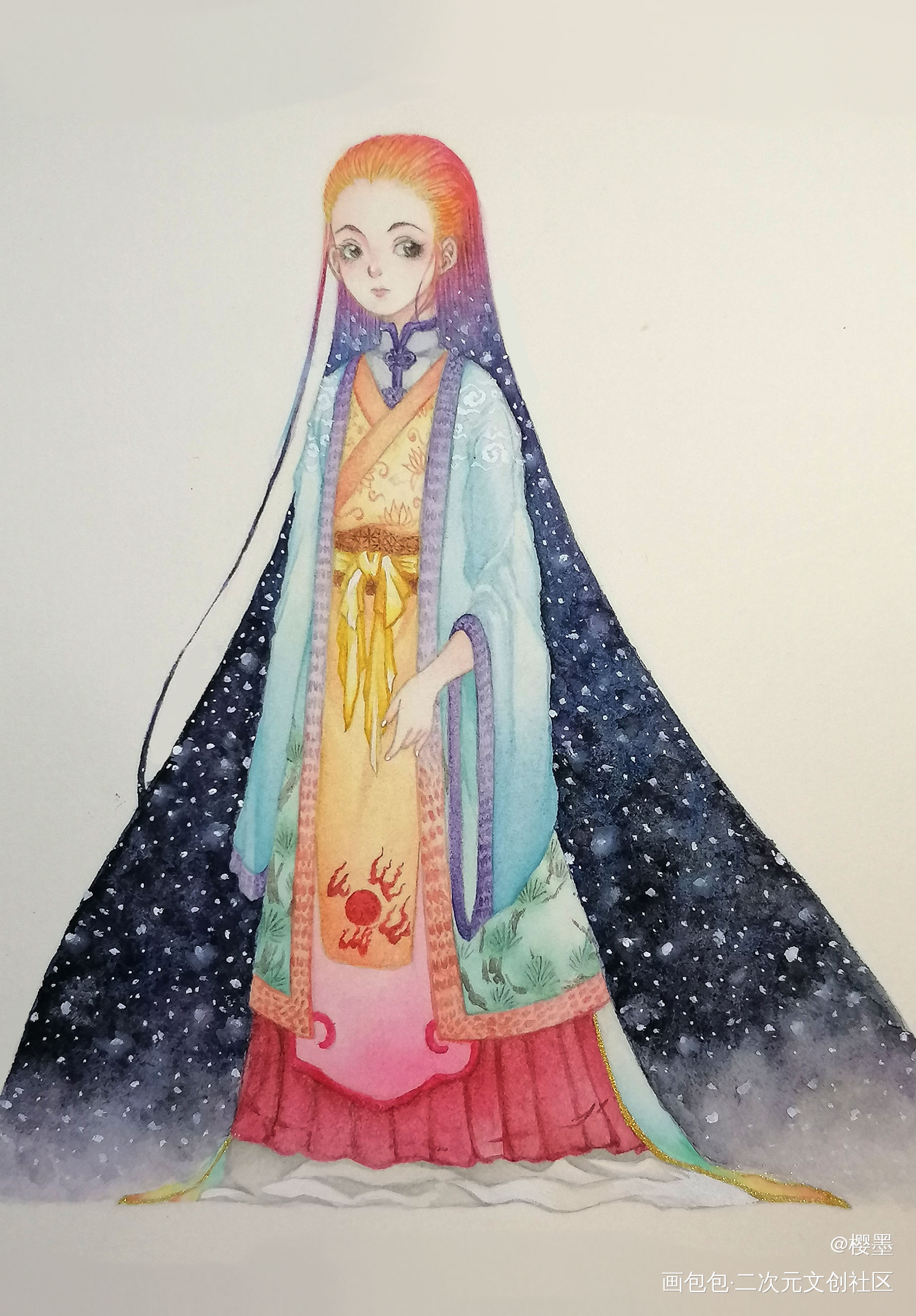 ——白昼是如何变成夜晚的? 司掌黄昏的神明会乘着金乌飞过天空,扬起载满星河的长发。我们所看到的夜晚,便是神明经过的痕迹。 (是自设的神明体系中的世界观) p.s.因为「暮」实际的头发是能铺成整个夜空的…所以立绘就是直接在最下面渐变淡出去了,就是可以延伸到画幅之外好多好多…的意思!