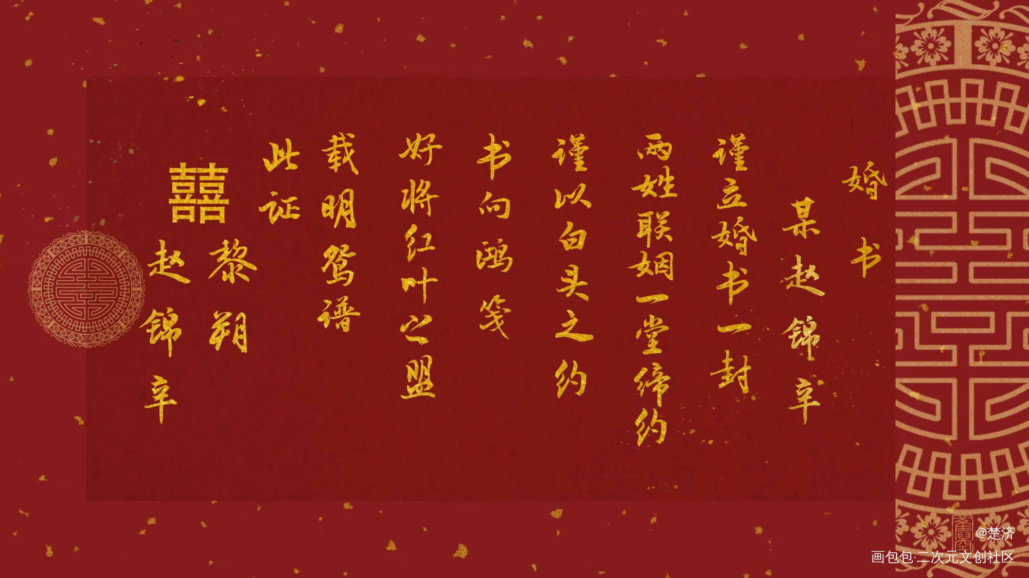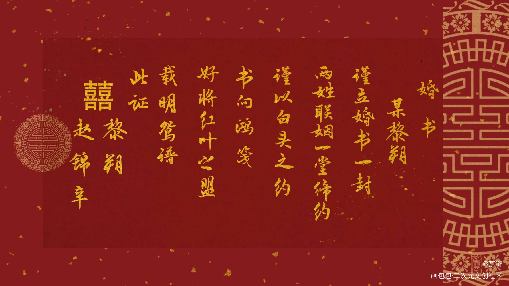 自己做的,参考了不枉和民国婚书,自我理解民国婚书受众于夫妻,查了一下原文解释后最终决定这样写,合法夫夫赵锦辛黎朔