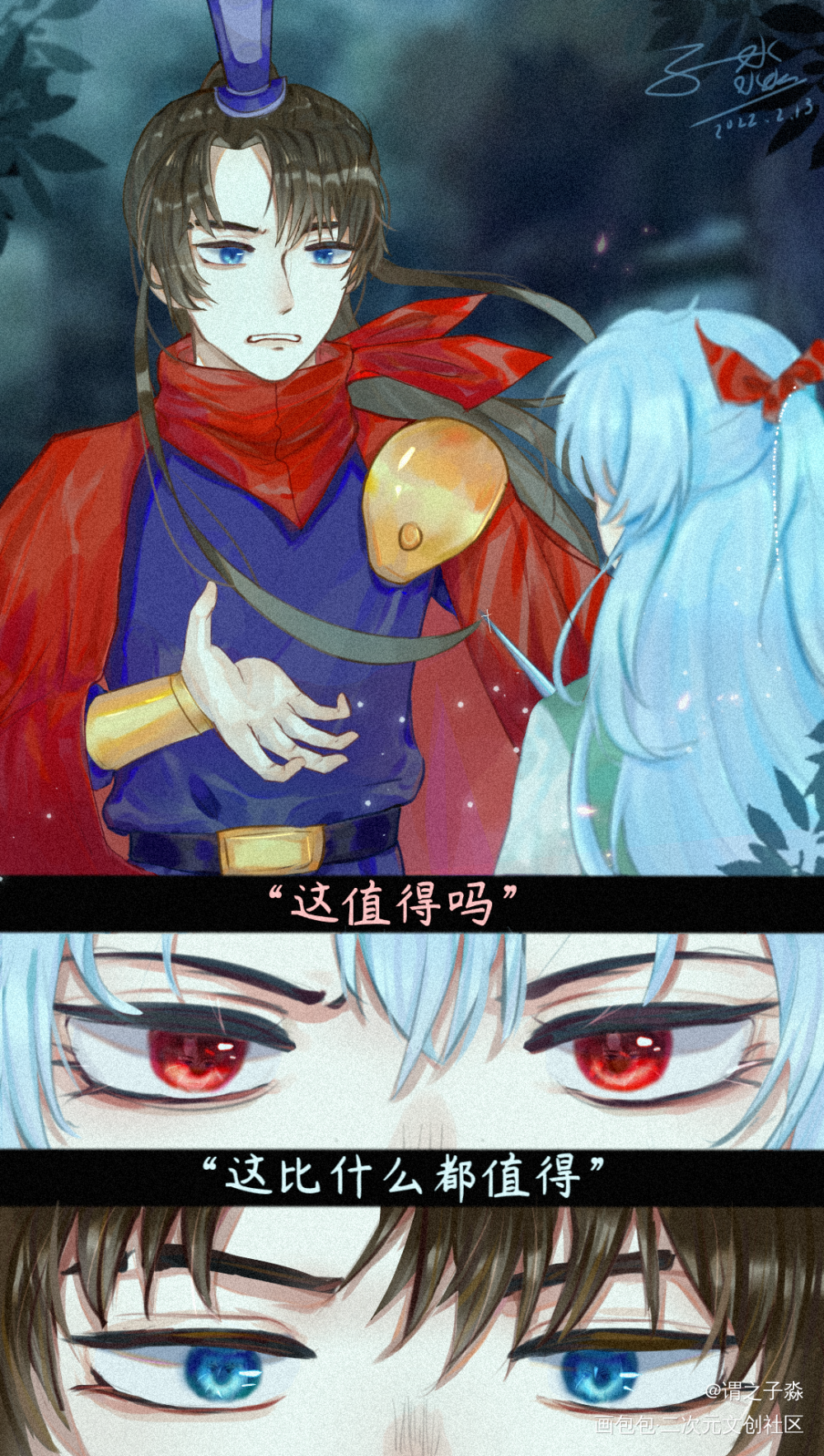 “为了别人,你不惜搭上自己的生命,这值得吗” “为了森林的和平,不惜牺牲我自己,这比什么都值得” 之前参加黑蓝24h情人节活动的图 我到底发没发出来,可恶,我的画包包好卡