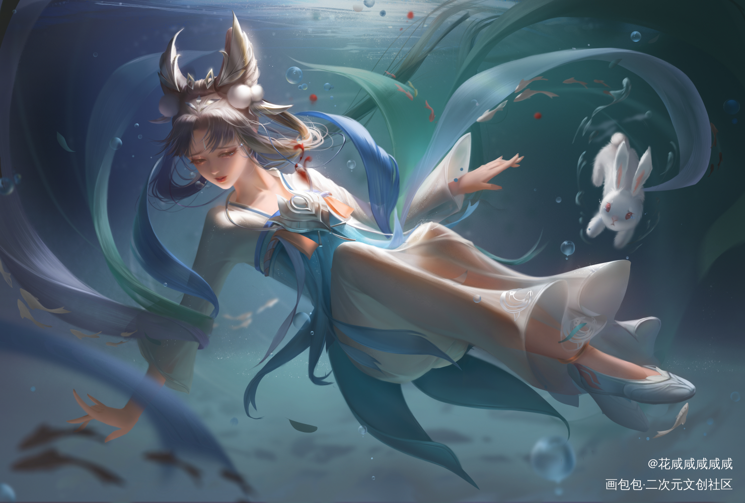 嫦娥受伤跌入水中,兔子过来唤醒她