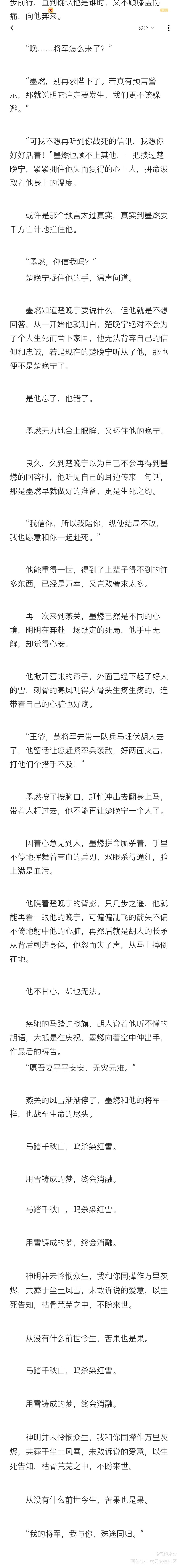 神明并未怜悯众生,我和你同撵作万里灰烬,共葬于尘土风雪,未敢诉说的爱意,以生死告知,枯骨荒芜之中,不盼来世。 从没有什么前世今生,苦果也是果。 “我的将军,我与你,殊途同归。”